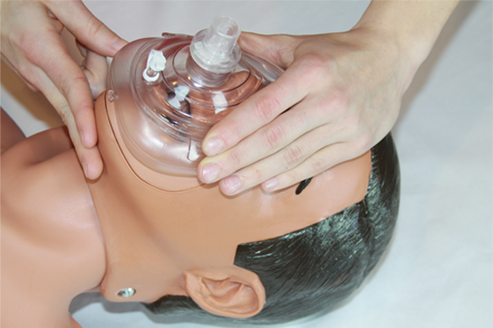 Breathing masks cover the victim’s nose and mouth. The hand on the head is used to push down on the forehead while your fingers cup the mask and push it down to create a seal around the victim’s mouth. Your other hand is used to lift up on the chin to open the airway.