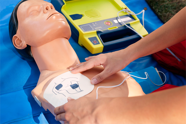 Defibrillation: Turn on the AED (automated external defibrillator) and follow the voice prompts.