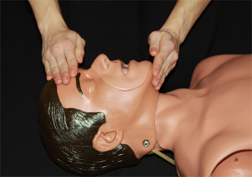 With the victim flat on their back, place one hand on their forehead and the other hand underneath their chin. Gently push down on the forehead while lifting the chin to effectively open the victim’s airway. Avoid lifting on the chin too hard as this can close the mouth or cause unintentional injury.